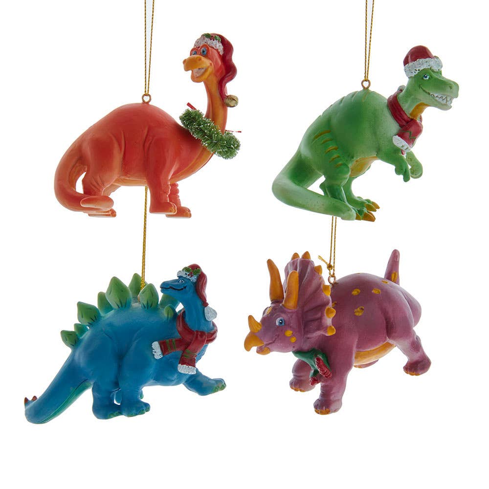 Have a holly, jolly winter with these festive dinos! Our 4" multi-colored resin ornaments include a purple triceratops wearing a green & red scarf, a green T-Rex with a Santa hat & red scarf, a blue stegosaurus with a Santa hat & red scarf, and an orange brontosaurus with a Santa hat & wreath!