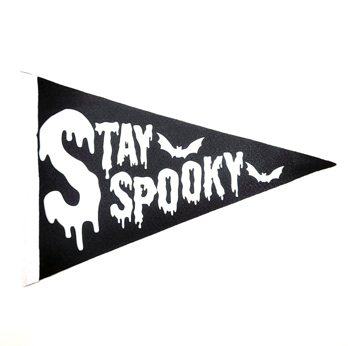 Stay Spooky 10"X15" felt pennant. Hand cut and sewn from black acrylic felt with a white border. They are soft felt, not stiff but work well for hanging on walls.