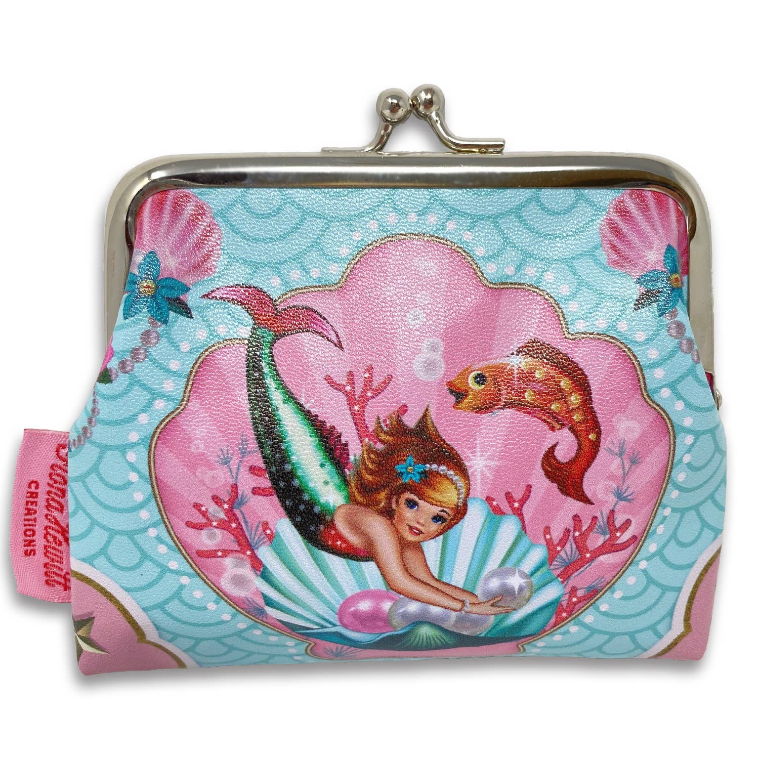 She comes from the ocean, this sweet girl from the sea. She comes with good fortune for you and for me. A big sparkling pearl, and candy-striped fish, all around it's a fun-candy-dish. Come see a pink seahorse just hanging out or a pretty jelly fish just swimming about. This coin purse, what a treat, what a terrific 'souvenir', from SugarLand.
