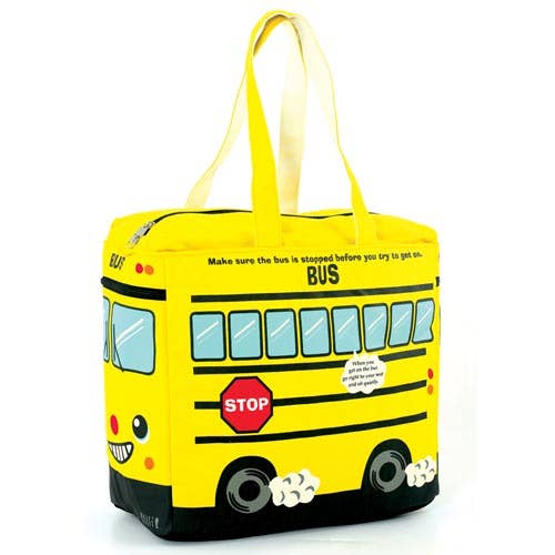 Canvas Yellow Bus Tote Bag. Insulated Bag. Sturdy Canvas Material Measures Approx: 14.5"(L) x 6"(W) x 12"(H) Top Zip Closure, 10" Shoulder Drop