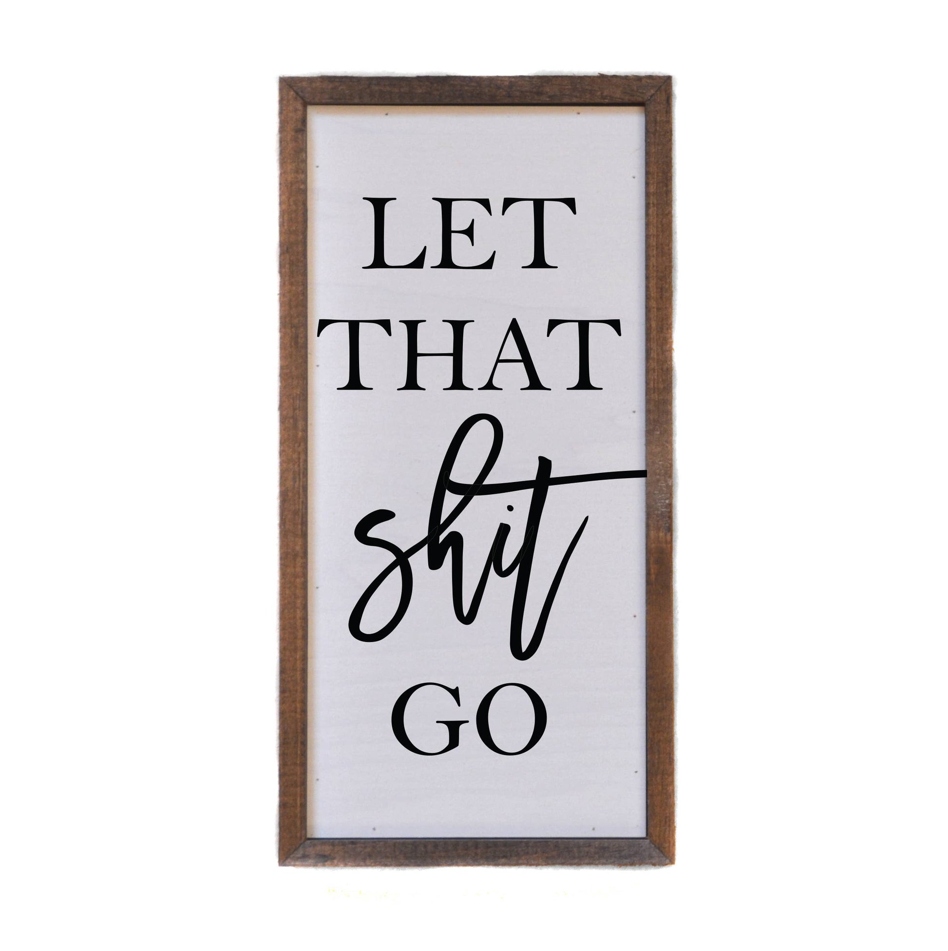12x6 Let That Shit Go Wall Sign or Desk Sitter. All our signs are build into a wooden box frame with a rustic touch. Signs are hung directly off the frame or will sit on a shelf. This piece is perfect for adding a little bit of sass without shouting it from the rooftops. Inspiring to look at, and beautiful to show off - it's the perfect addition to your home. !!!