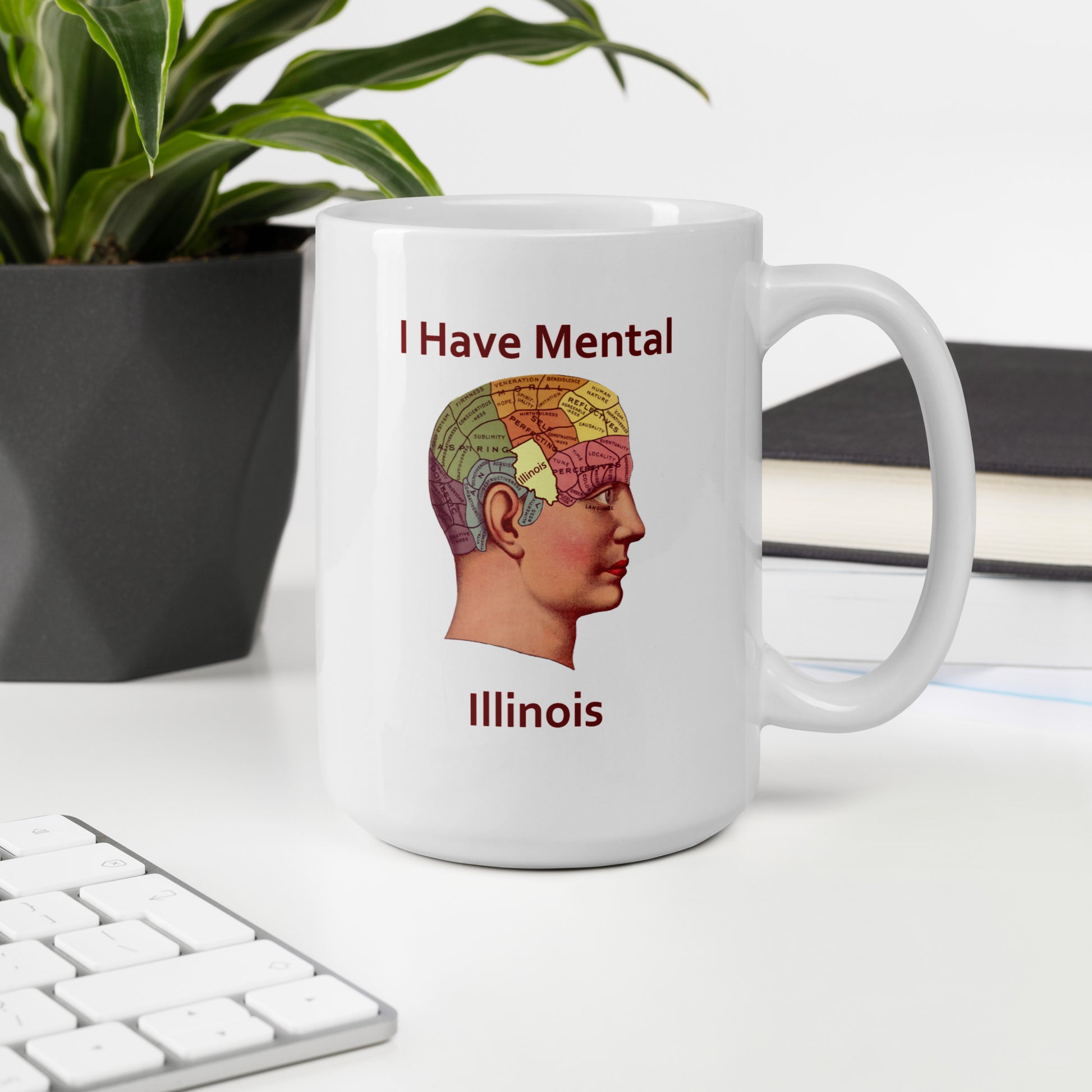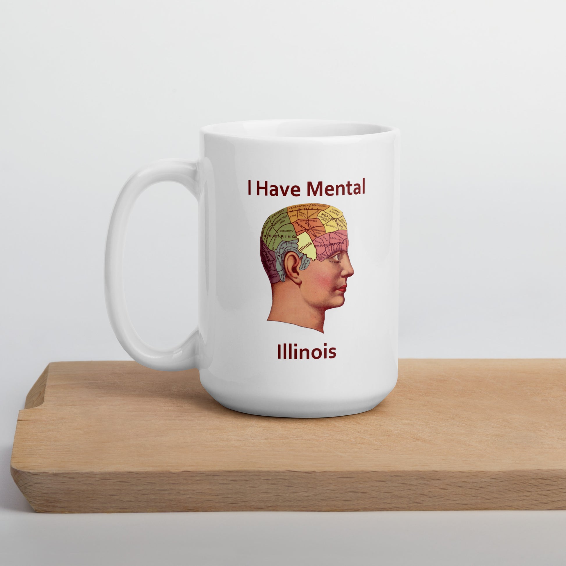 This funny coffee mug is sure to perk up your morning routine! With its I Have Mental Illinois Phrenology Head design, this mug will tickle your funnybone and show off your dark sense of humor. Whether you are an Illinois native or just appreciate a good pun, this mug will be your go-to for a daily dose of laughter!