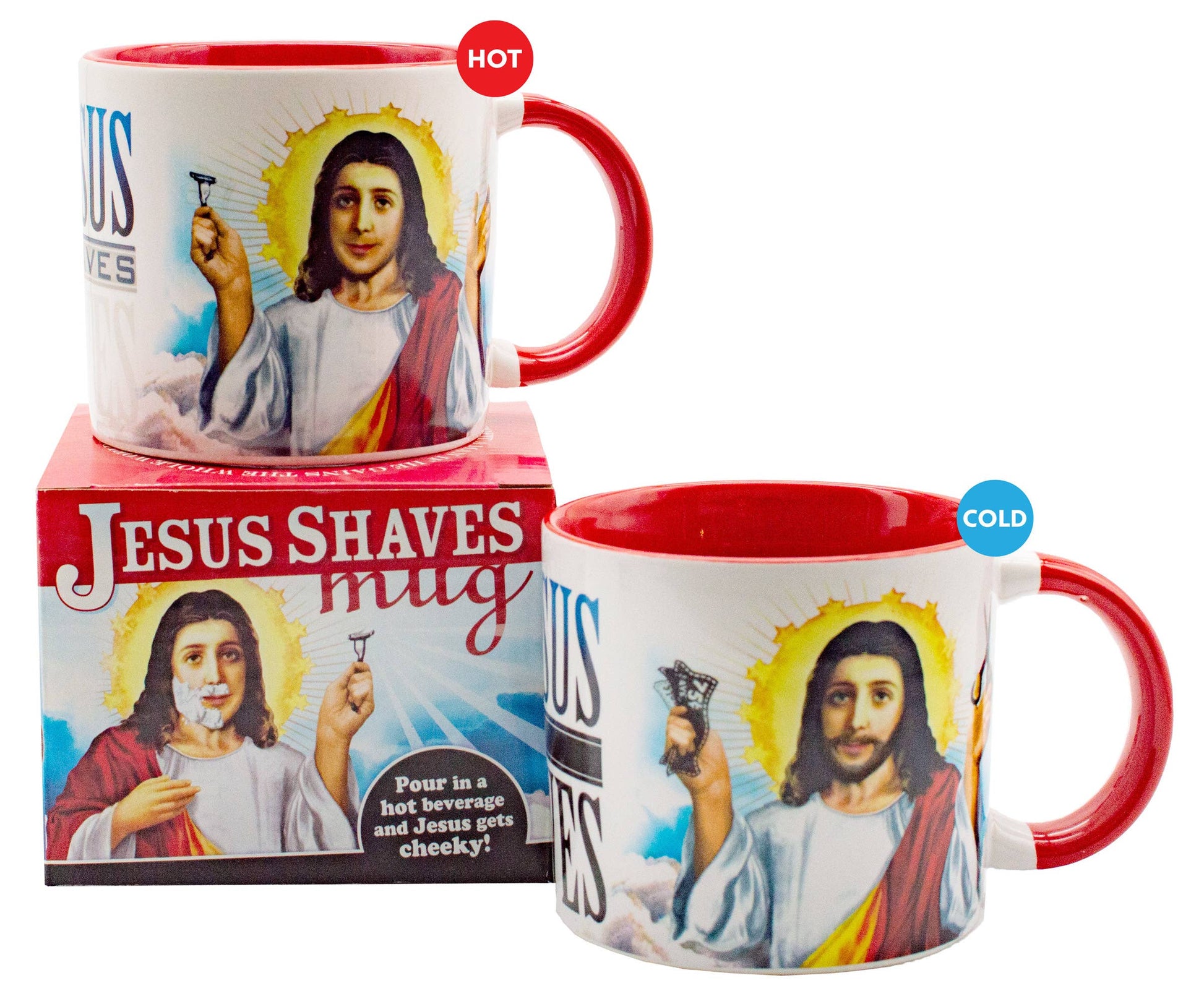 The Jesus Shaves Mug begins with the traditional bearded Jesus. But when you pour in hot liquid, a miracle transpires-His beard gradually vanishes before your very eyes! Before too long, you are looking at a clean-shaven Messiah. Hallelujah! • 14 oz. Ceramic coffee cup with a comfortable handle.